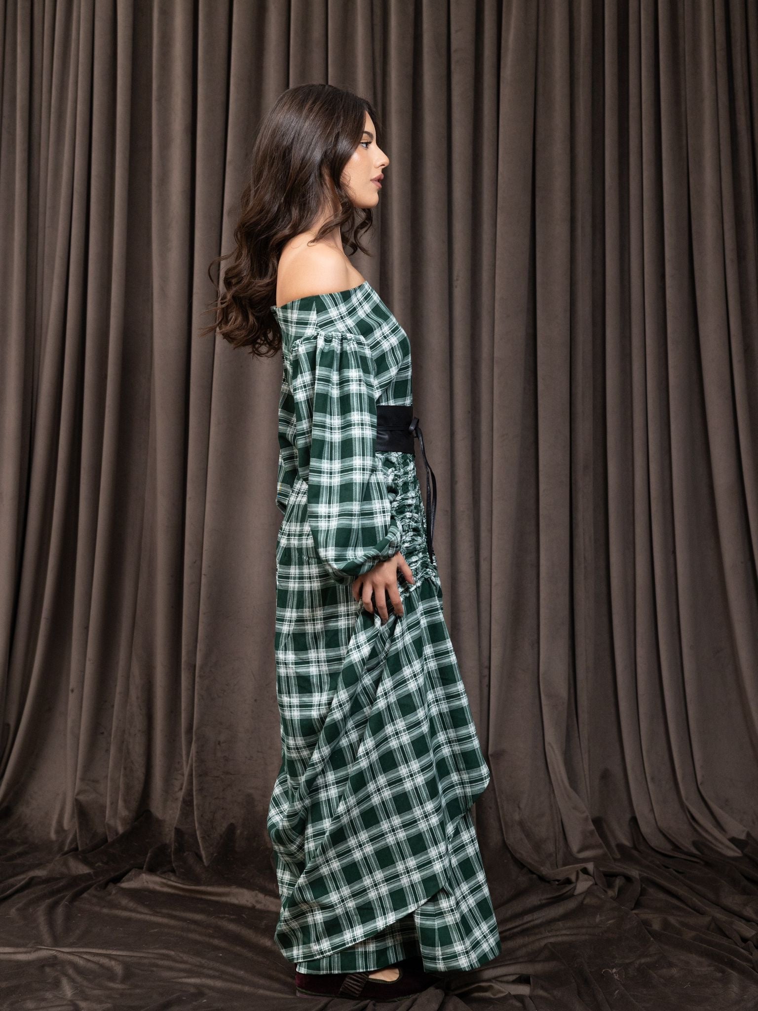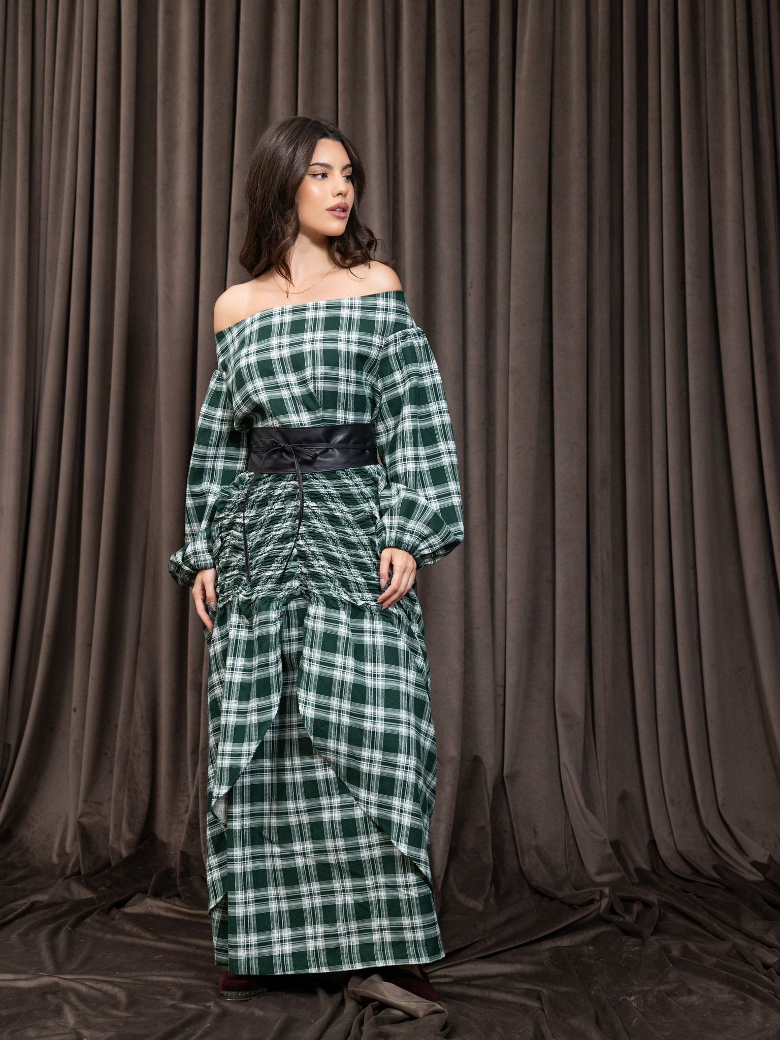 A modern off-shoulder abaya dress.